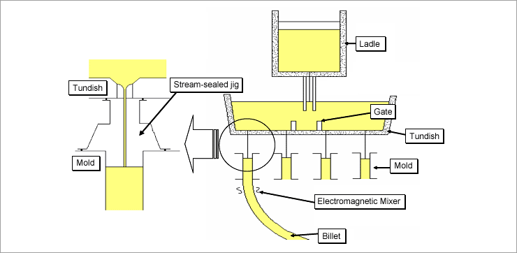 UBS developed “Stream-sealed jig� and it enable for small size billet to be casted under air cut condition between tundish and mold, then non-ferrous inclusion presented in molten metal was drastically reduced and molten metal was prevented from being oxidized during casting.